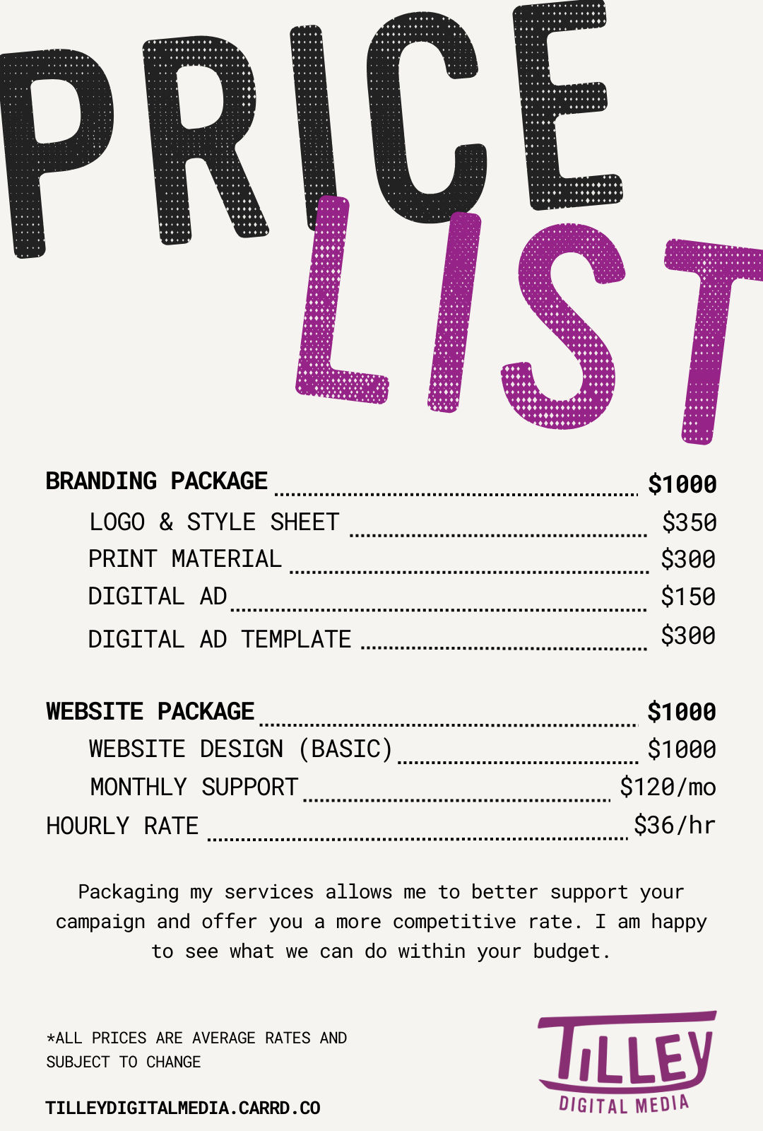 Need a website to stand out from your opponent? Need mailers, digital ads, or hell, even some merch to get your name out? Or maybe you dipped your toes in the political scene, and now you need people to know what you stand for.Don't sweat it. I'm Tilley, and with over 15 years of graphic and web design under my belt, and as the former VP of Young Democrats of Denton County, I am happy to design your campaign's visual needs.I offer website and brand design packages at competitive rates. Scroll around to see some select highlights of my work. If you like what you see, schedule a call, and let’s see what we can make together!